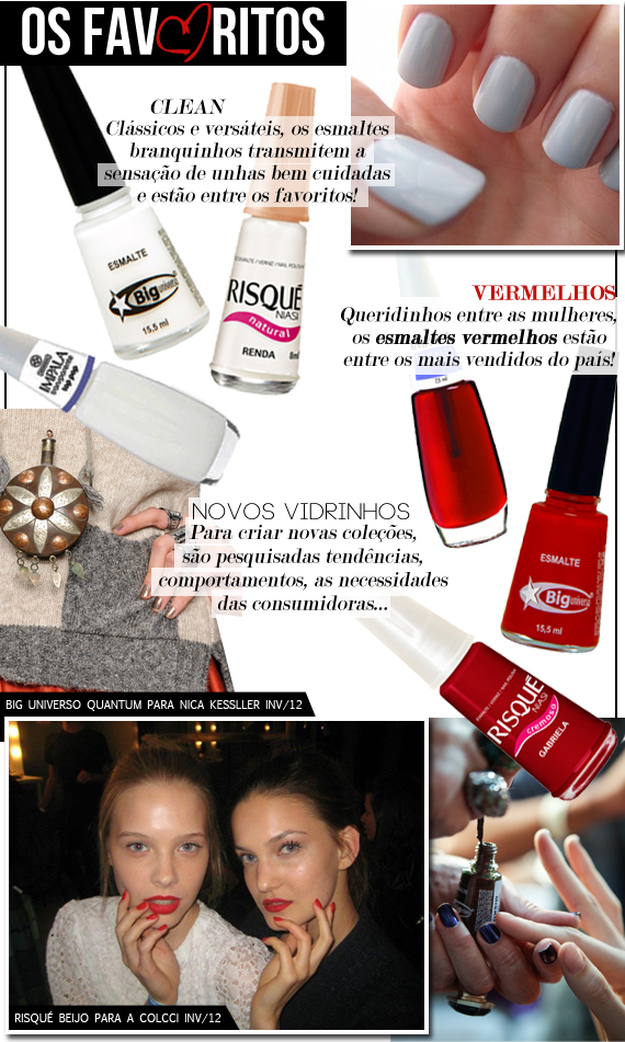 De acordo com Daniela Brilha, do marketing da Risqué, “as brasileiras gostam do tom suave porque sempre está na moda e dá a impressão de uma unha bem cuidada e feminina”. Que atire a primeira pedra quem não tem (ou nunca teve!) um Renda em casa! Já os vermelhos dão aquele upno visual, como o ultra-clássico Gabriela. Não há Péridot que segure!!!